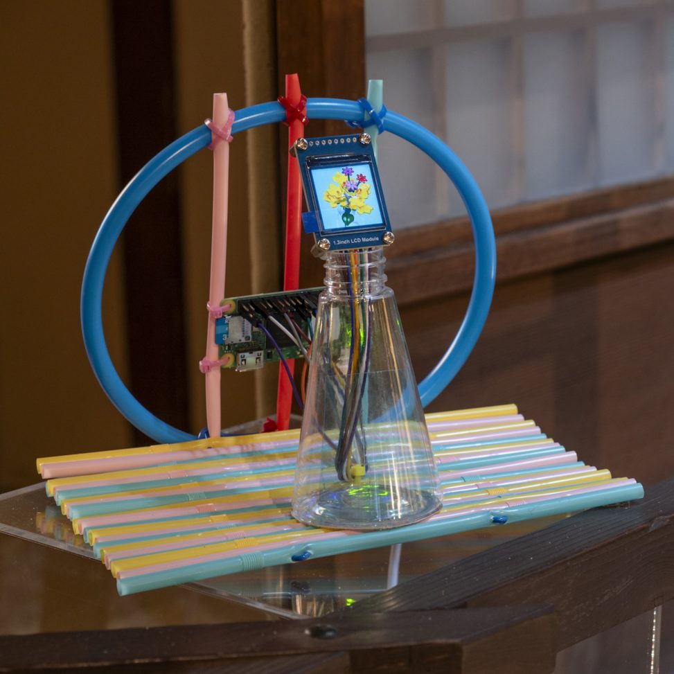 映像(9 分 7 秒),1.3inch モニタ ,Raspberry Pi, ボトル , 合皮 ,ビニールシート , 投げ輪の輪 , ストロー , 針金 , 結束バンド
