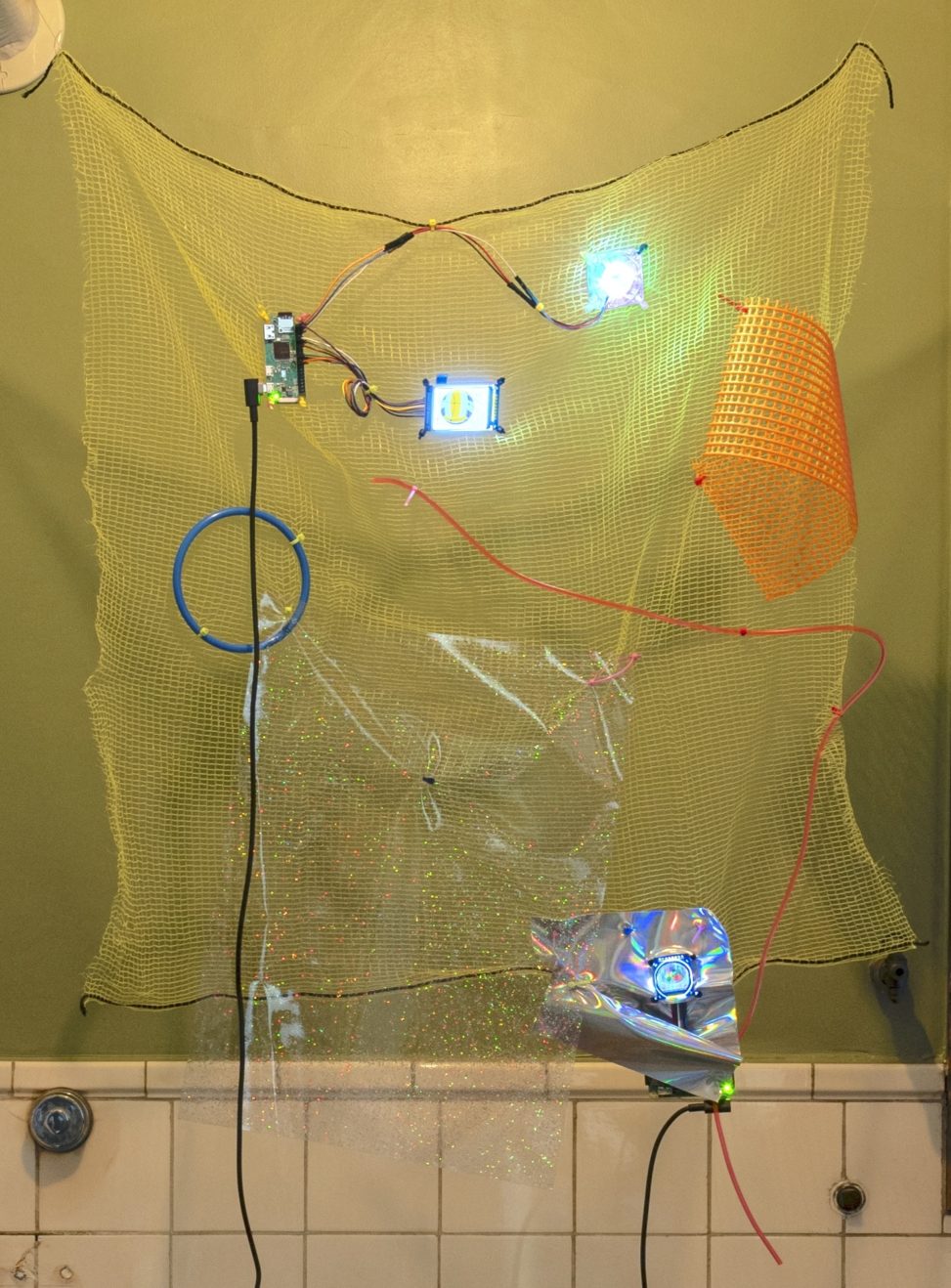 映像(上 :6 分 14 秒 / 下 :6 分 17 秒),2inch モニタ ,0.96inch モニタ ,Raspberry Pi, 冷却ファン , ネット , 縄跳び , 樹脂成型ネット ,合皮 , ビニールシート , 投げ輪の輪 , 結束バンド